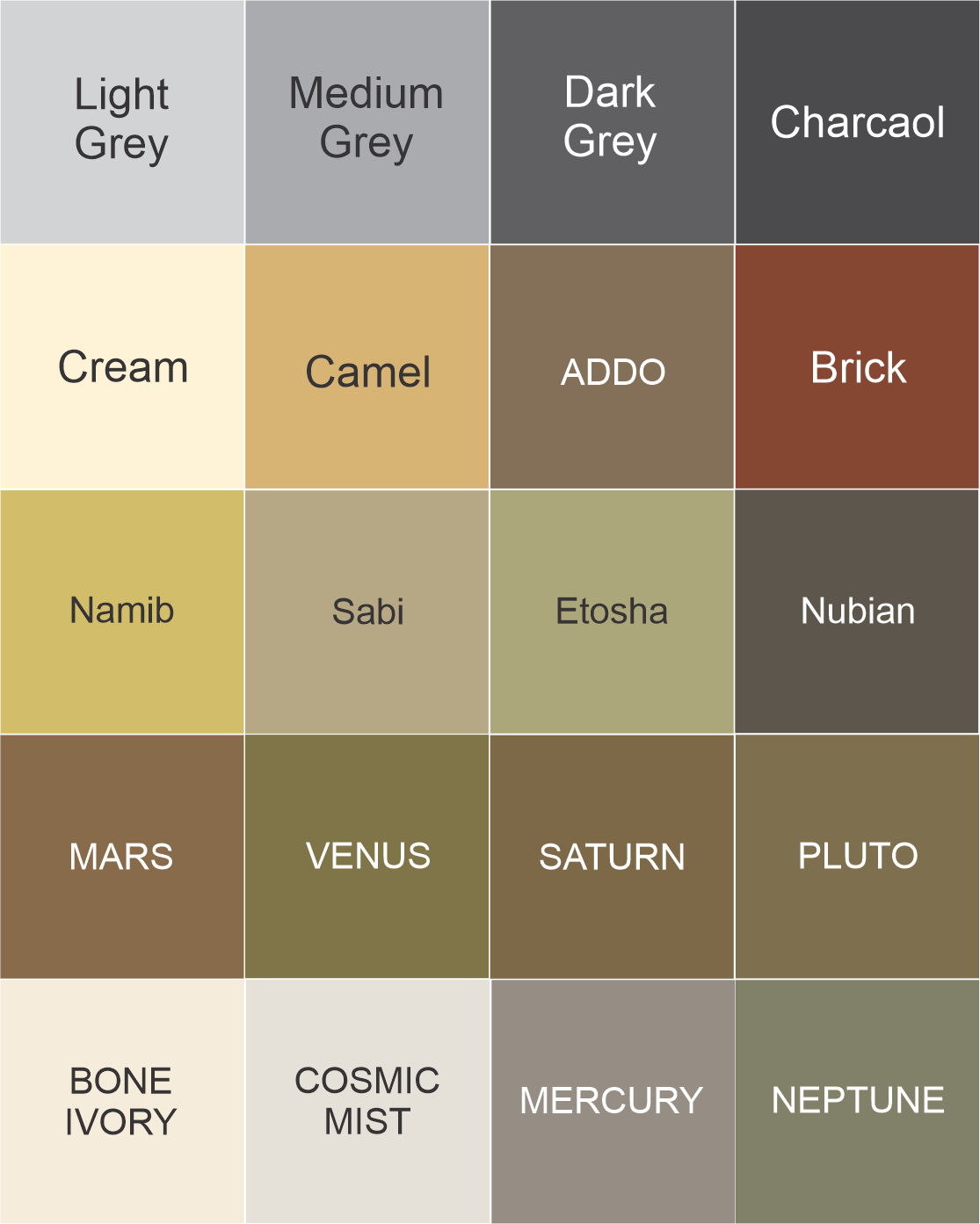 Decide on a colour you like or want and send us the code number as an example the code for a light grey is 7035 and that's all we need. We will attempt to match the colour as close as the human eye can determine, but if you are looking for an exact colour, we cannot help you. Simply because colour like beauty is in the eye of the beholder. So no guarantees are even hinted at with regard to colours, it will be a close match but not exact. Also what you see on a screen is not what you will see in the sunlight or in a room lit by dim lighting or other influencing factors. However if you ask for a light grey, you will not get a dark green.